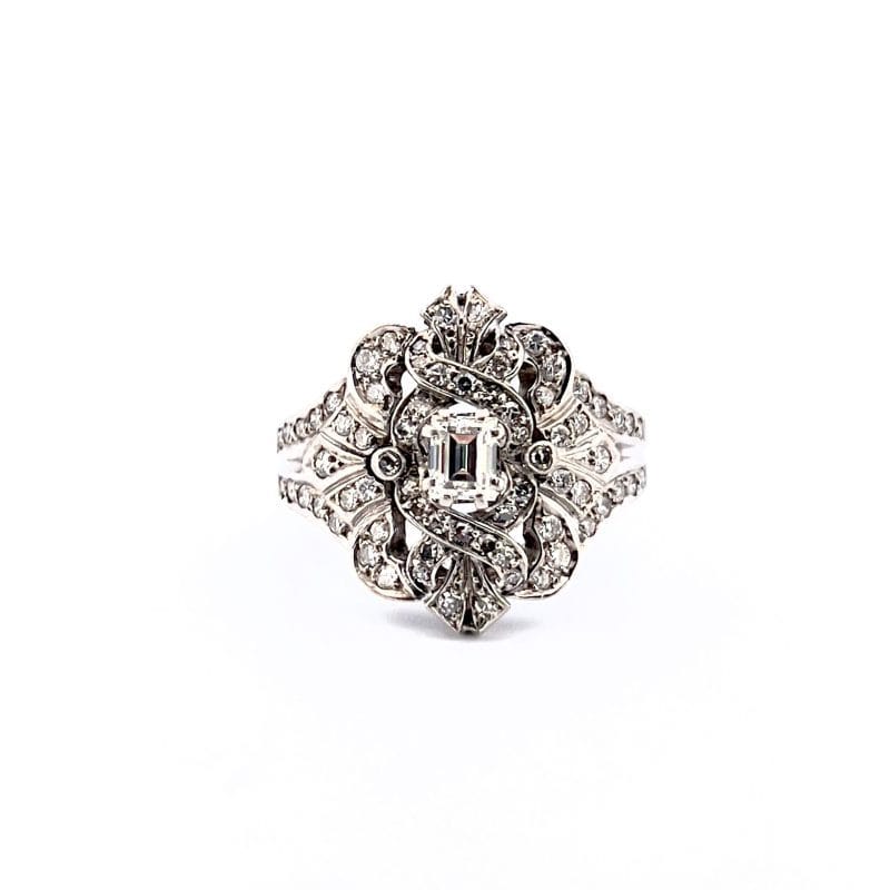 Bogato zdobiony pierścionek z diamentami w różnych szlifach. Przykuwa uwagę swoją nietuzinkową konstrukcją i blaskiem, który oddają diamenty. Białe złoto podkreśla jasną barwę kamieni, tworząc harmonijną całość.